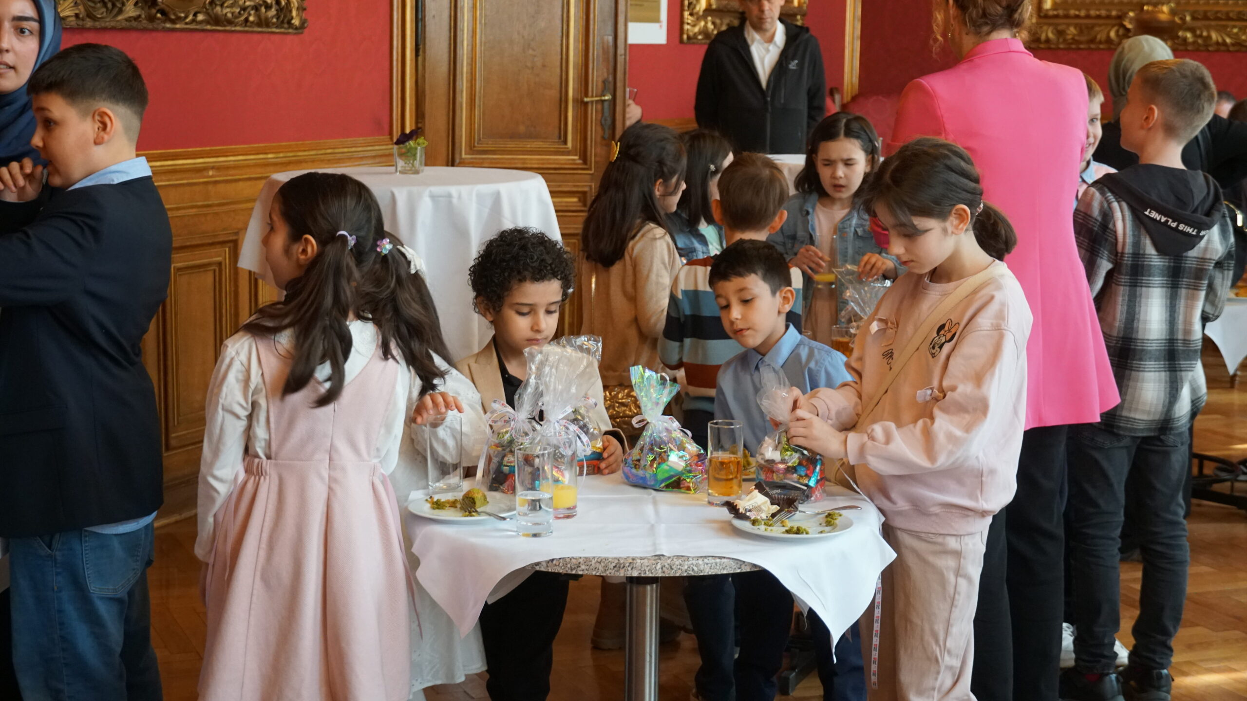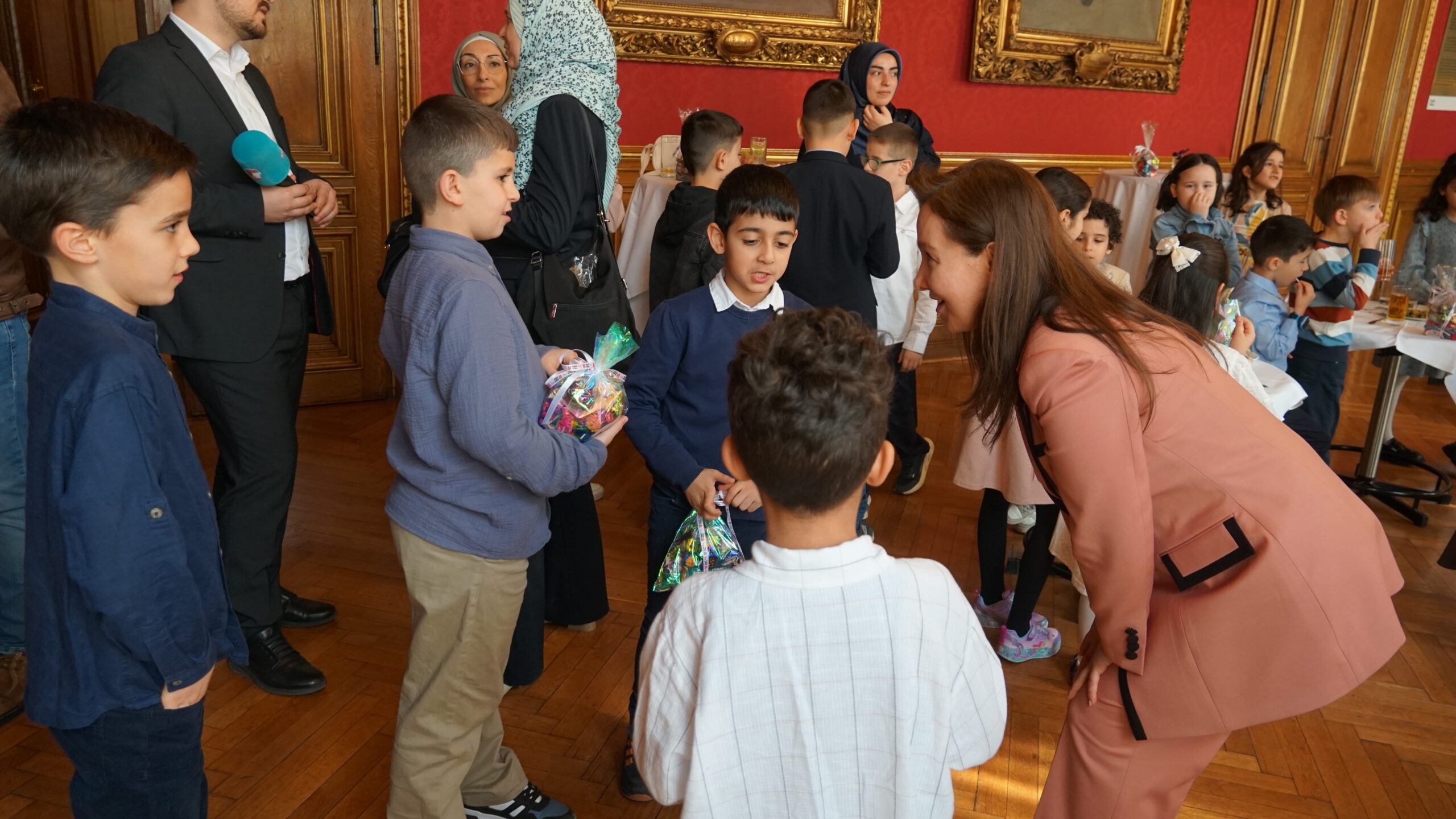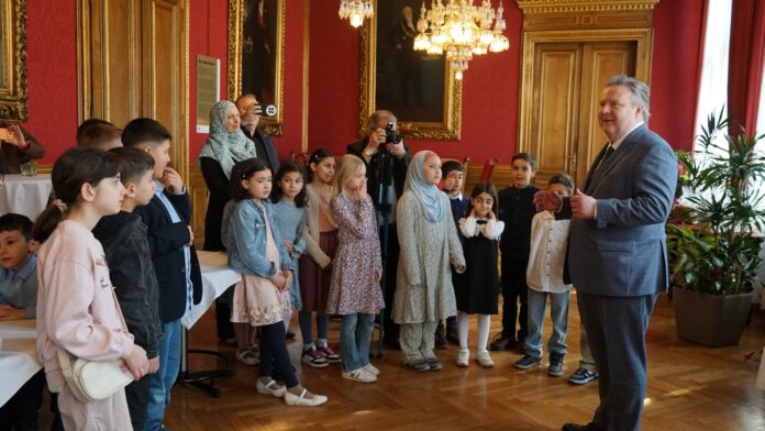 Çocukları Belediye Sarayı’nın ‘Roter Salon’ odasında ağırlayan Ludwig, çocuklara odanın önemini ve tarihini anlattı.